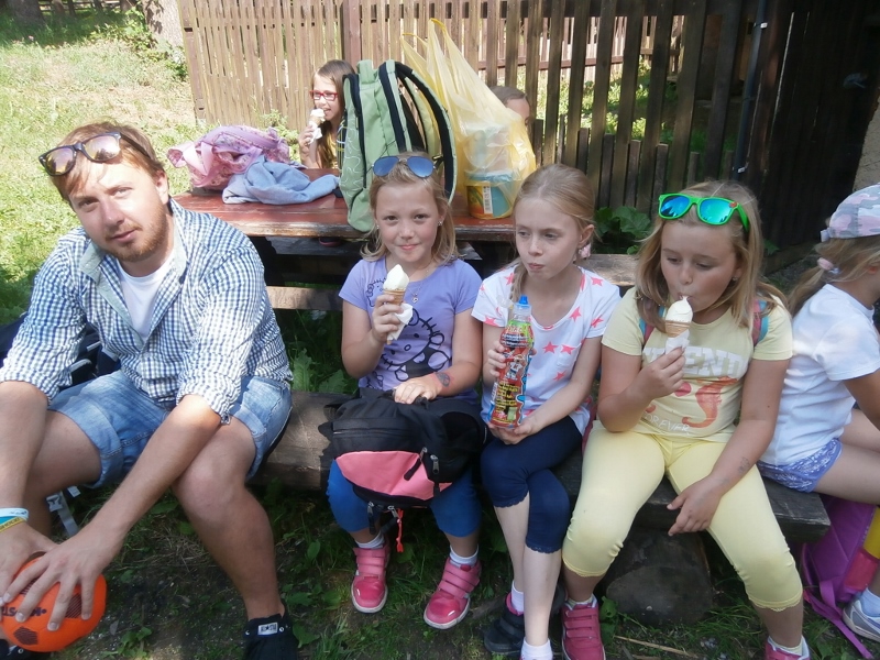 náladě. Po ubytování a obědě jsme si vybalili a podnikli první výpravu. Vyrazili jsme na prohlídku Bedřichova, která skončila u koupaliště Dolina. Zde jsme se odměnili zmrzlinou a také jsme si zchladili nohy ve vodě. Večer jsme si připomněli zásady chování na škole v přírodě a zahráli si míčové hry.