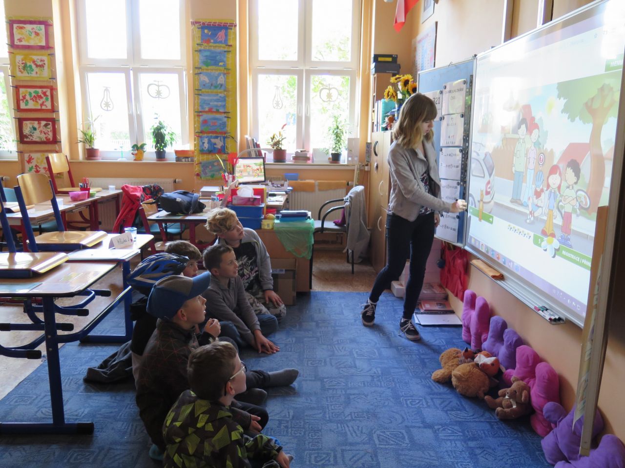 Žáci 1. - 3. třídy měli vlastní program v tělocvičně školy, kde si vyzkoušeli roli policistů a účastníků silničního provozu.