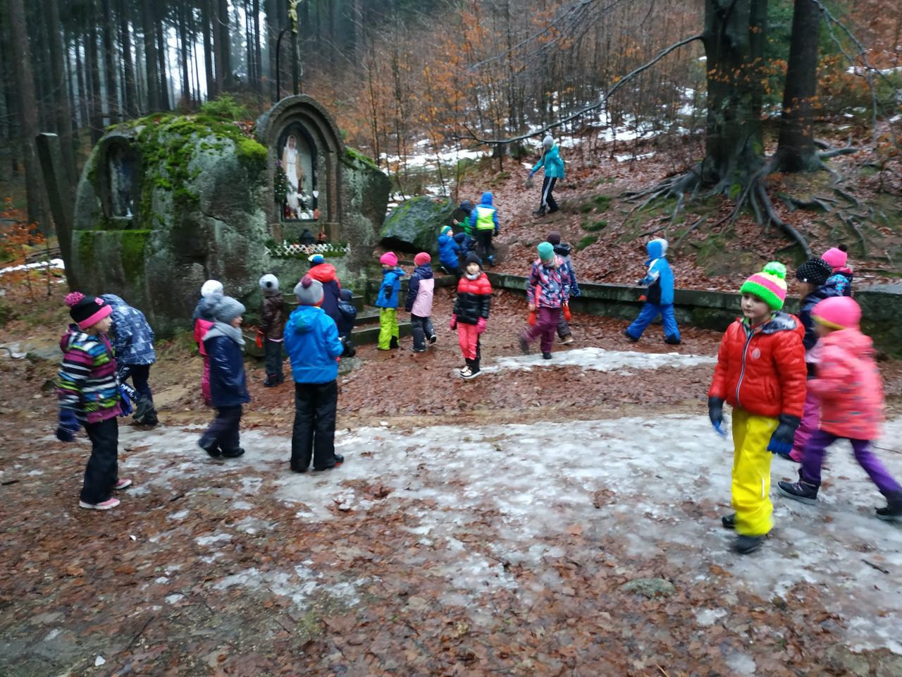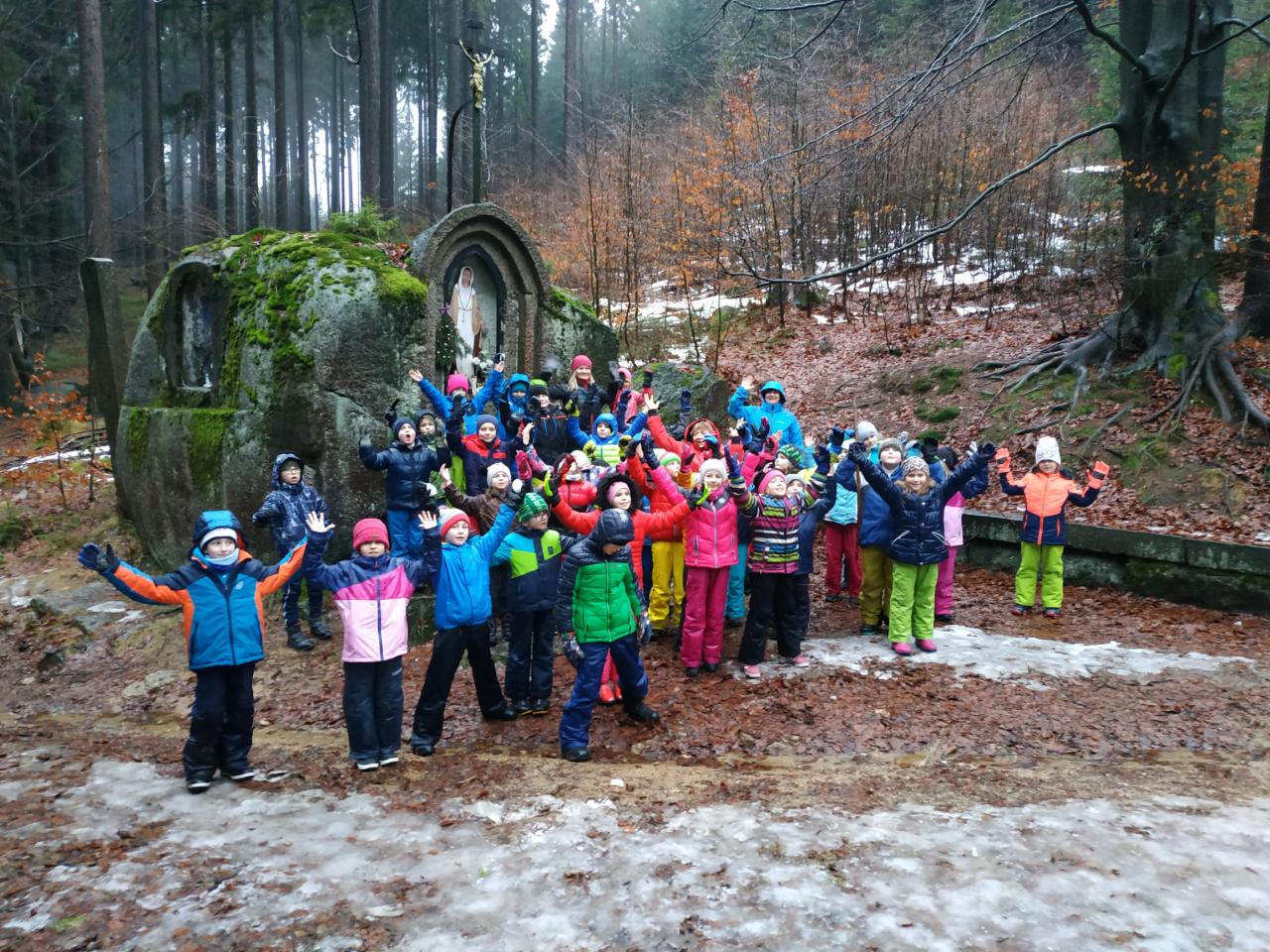 Druhý den nám počasí moc nepřálo. Přesto jsme se vydali na výpravu k chalupě Hašlerka, kde jsme u kapličky udělali sněhový rituál.