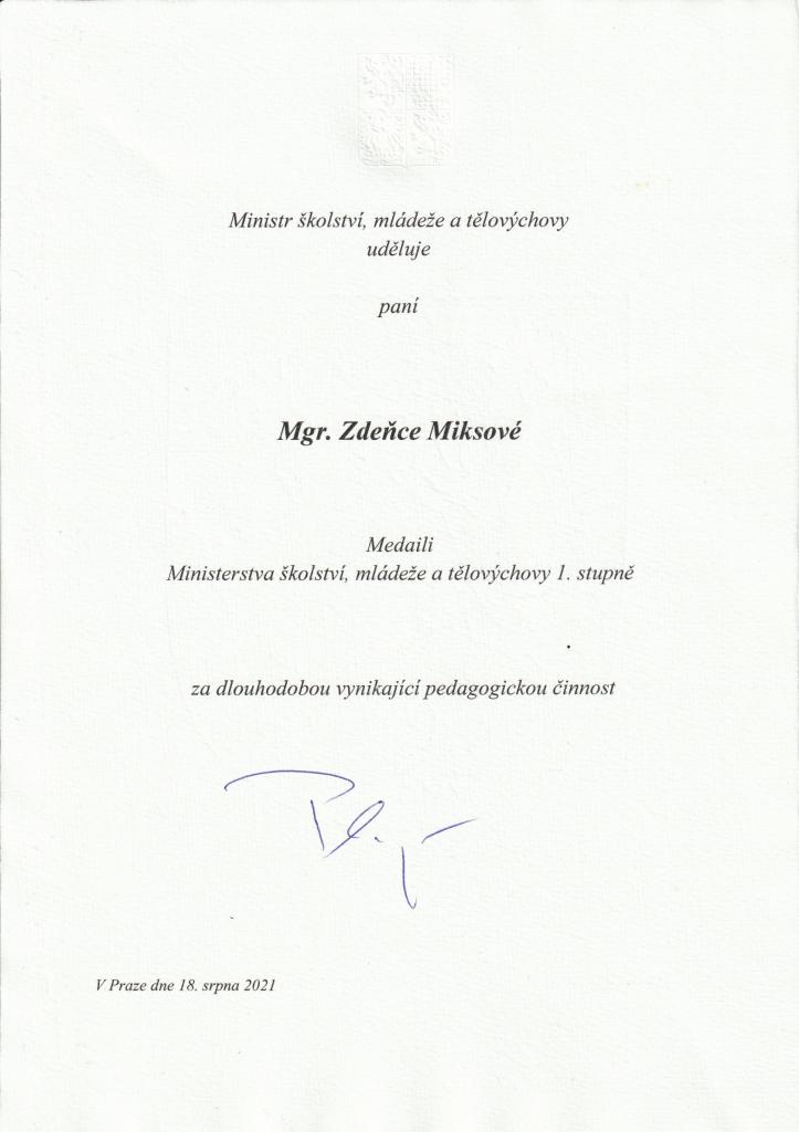 Tuto stříbrnou medaili obdržela i naše dlouholetá kolegyně Mgr. Zdena Miksová.