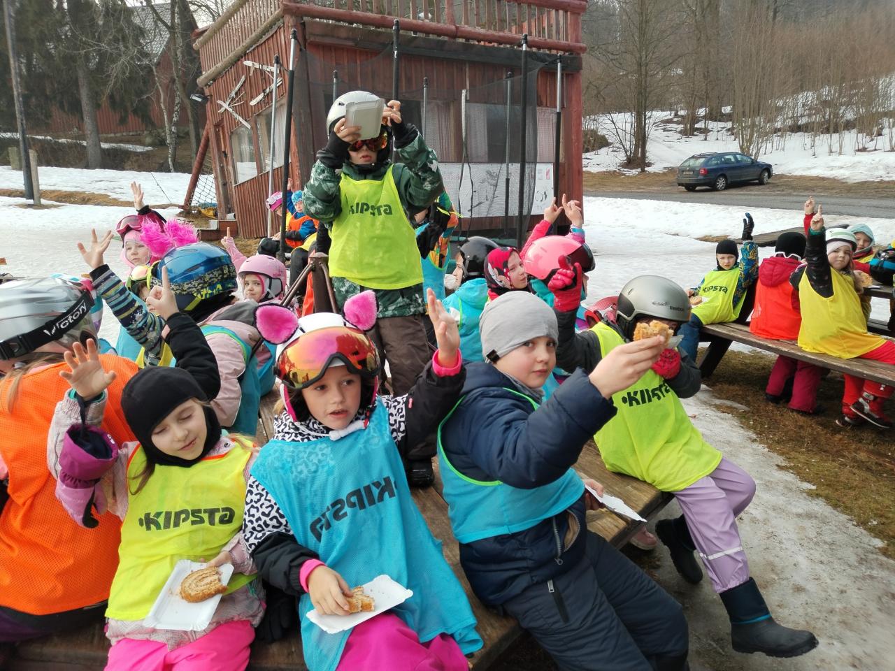 Dnešní den jsme se probudili do mlhy, kupodivu lyžování nám za menší viditelnosti nevadilo a šlo nám výtečně. Po obědě jsme šli opět na svah, abychom využili co nejvíce možnosti lyžování, sněhu na sjezdovce ubývá. Odpoledne jezdily na pomě již všechny děti a zvládly sjet i velký svah. Po lyžování jsme si pochutnali na medové roládě. Večer jsme sehráli scénky v našich týmech" Jak získat poklad skřítka Petrusáka" , vysprchovali jsme se a už spíme v postýlkách.