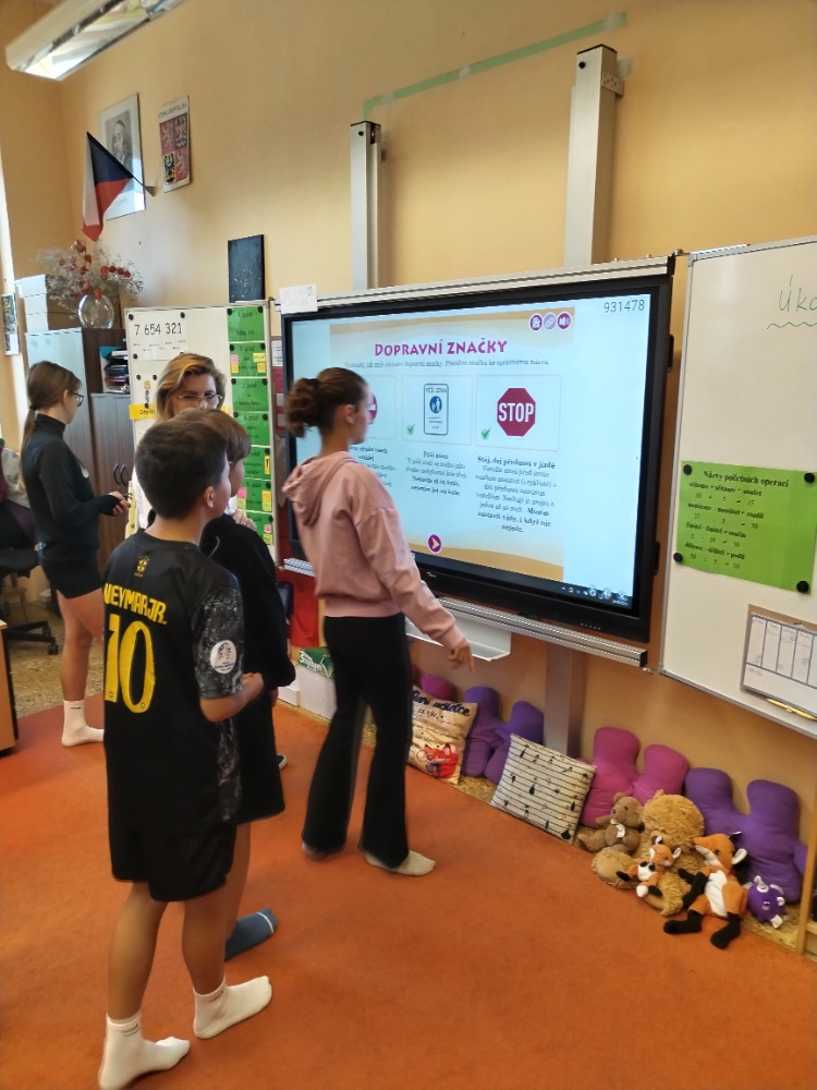Žáci 1.–3. ročníku si měli možnost vyzkoušet, jaké to je být účastníkem silničního provozu na Mobilním dopravním hřišti, které zavítalo k nám do školy. Pod dohledem zkušených lektorů se žáci střídali v rolích chodců, řidičů a policistů. Na připravených křižovatkách a přechodech se učili, jak správně přecházet vozovku, poznávali základní dopravní značky a vyzkoušeli si jízdu podle pravidel silničního provozu.