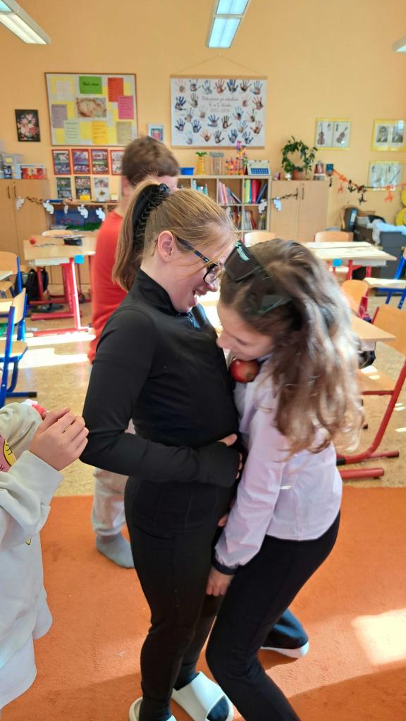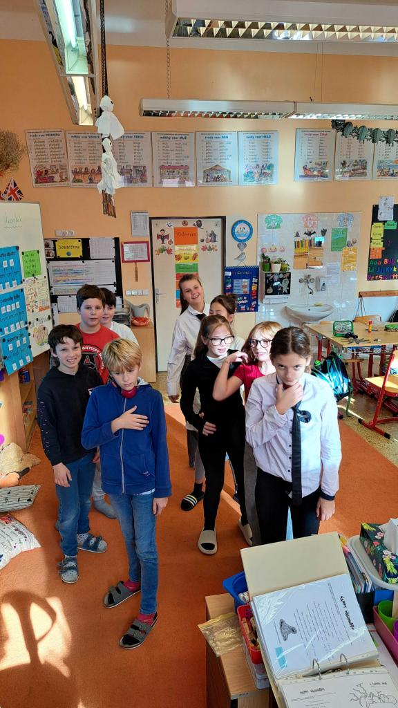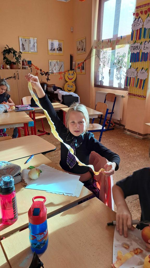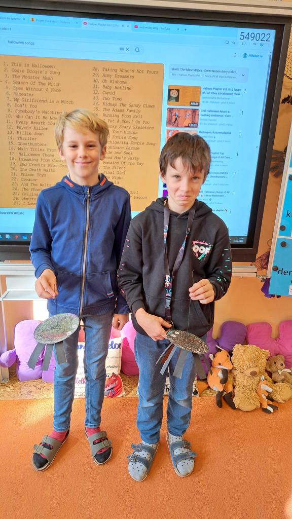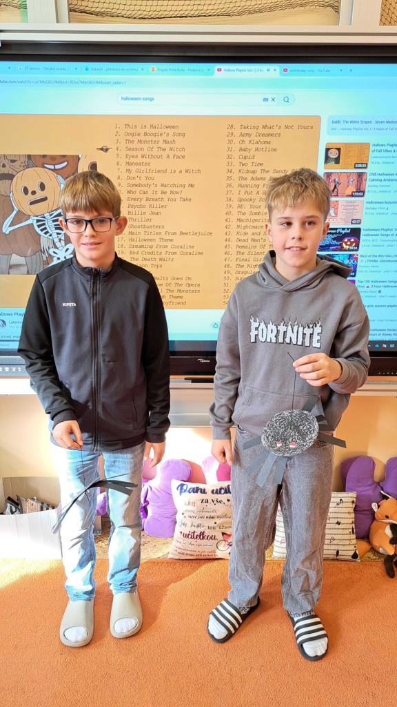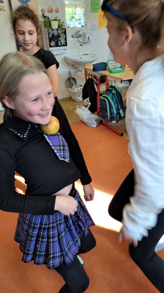 Ve čtvrtek 30.10. a v pátek 31.10.2025 jsme oslavili Halloween. Děti se opět převlekly do kostýmů a ve třídě se zase objevili duchové, čarodějnice, příšery, dýně a upíři. Připomněli jsme si příběh o Jackovi, zopakovali jsme si, proč se některým dýním říká „pumpkin“ a některým „Jack-o'-lantern“, přečetli jsme si českou i anglickou básničku na Halloween a zazpívali jsme si a „zaspellovali“ písničku H-A-double L-O-W-double E- N spells Halloween. Naučili jsme se základní slovíčka k Halloweenu a vyplnili si Halloweenský pracovní list v Čj a v Ma. Vyhlásili jsme i soutěž o nejdelší slupku z jablka. Děti si vyzkoušely oloupat jablko. Ten, který měl nejdelší slupku, vyhrál.(Apple Patiny). Po oba dny jsme hráli Halloweenské BINGO, zpívali další anglické Halloweenské písničky, naučili se nová anglická slovíčka a zatancovali jsme si Halloweenský tanec. Dětem se moc líbily hry, při kterých lovily jablka v míse s vodou (Bobbing for Apple) a ve dvou družstvech se snažily přemístit jablko spolužákovi za sebou pomocí brady (Apple Pass).