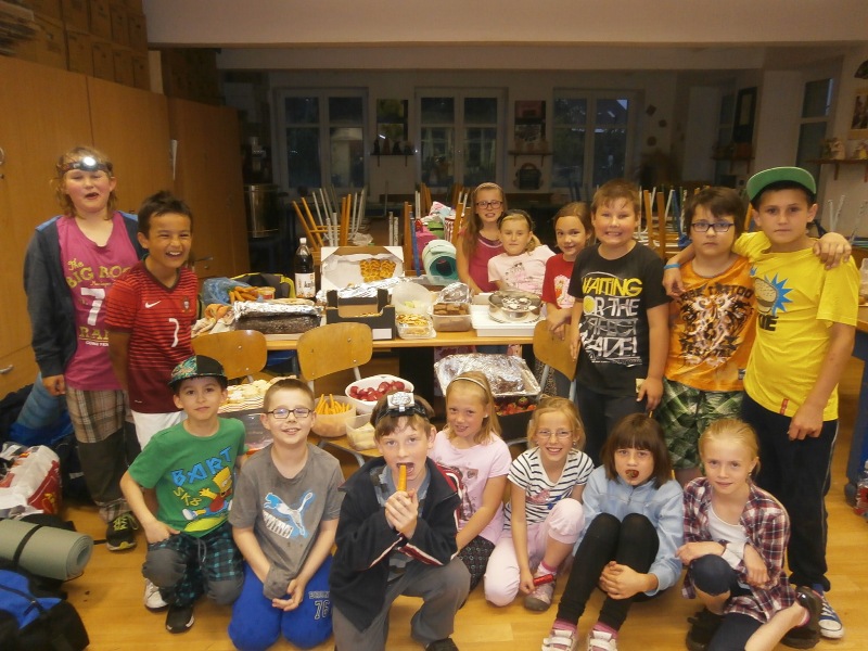 hodiny, chtěli jsme si to všichni užít ve škole přes noc. Počasí nám v pátek sice moc nepřálo, ale buřtíky s rodiči se nám nakonec upéct podařilo. Během dešťových přeháněk se děti stačily pěkně vyřádit na školním hřišti. Po setmění a rozbalení všech spacáků si vyzkoušely svou odvahu při noční hře. V úterý jsme se neučili a všichni jsme si užili sluníčka venku. Hladem jsme určitě netrpěli, protože pro nás maminky připravily spoustu úžasných, zdravých, slaných i sladkých dobrůtek J. Děkujeme J.