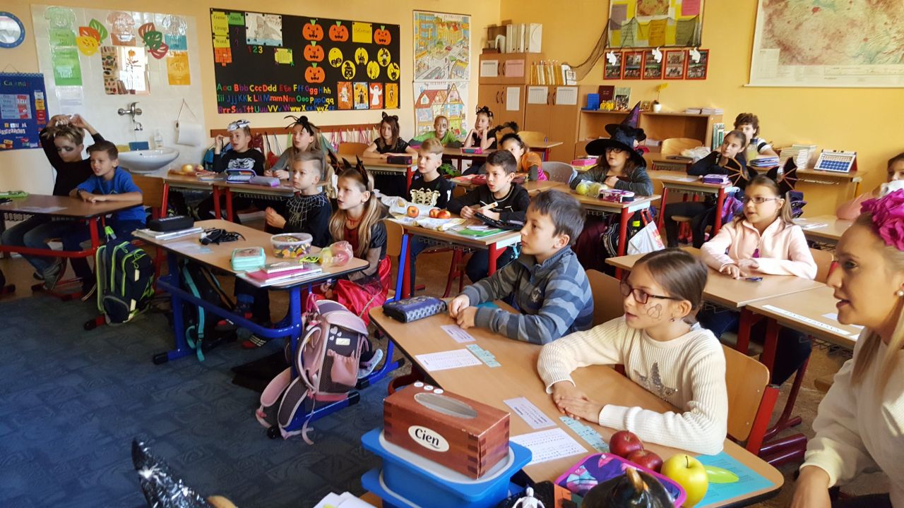 Žáci 4. třídy oslavovali ve středu 31.10.2018 a ve čtvrtek 1.11.2018 Halloween. Žáci se převlékli do nádherných kostýmů, ve třídě se tak objevili kostlivci, čarodějnice, spiderman, kočky, netopýři a další masky. Po oba dny jsme se učili anglické písničky, hráli hry s jablky. Nejvíce se dětem líbila hra, při které lovily jablka v míse s vodou. Hodně legrace jsme si užili při loupání jablek, snažili jsme se totiž o nejdelší slupku z jablka a při závodech předávání jablka pod bradou bez použití rukou. Naučili jsme se spoustu anglických slovíček, zazpívali anglické písničky, zahráli BINGO a procvičili jsme se v Halloweenském počítání a v Halloweenských cvičení z českého jazyka. Za každý splněný úkol děti dostaly i sladkou odměnu.
